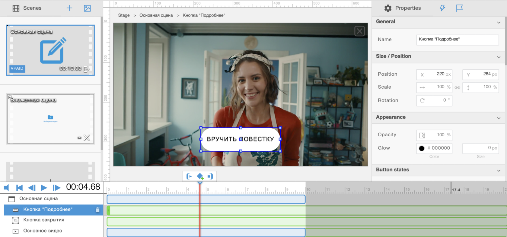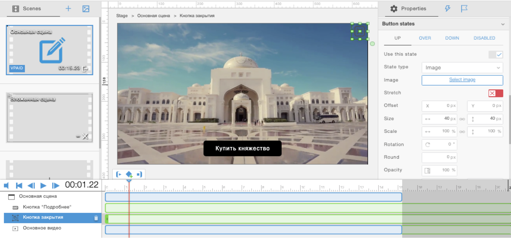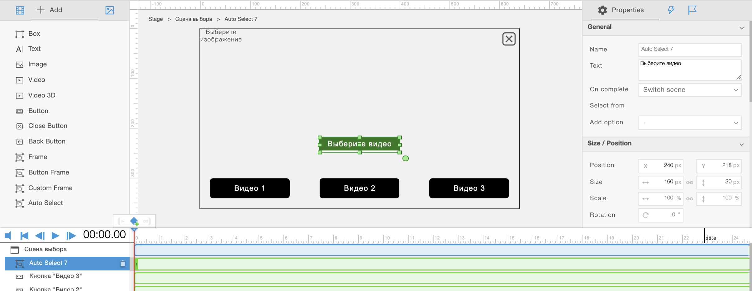 Добавляем на сцены все готовые визуалы (ролики, кнопки, картинки), даем им имена, расставляем на финальных местах